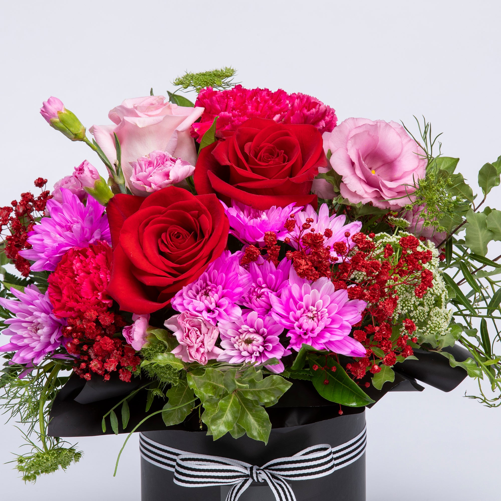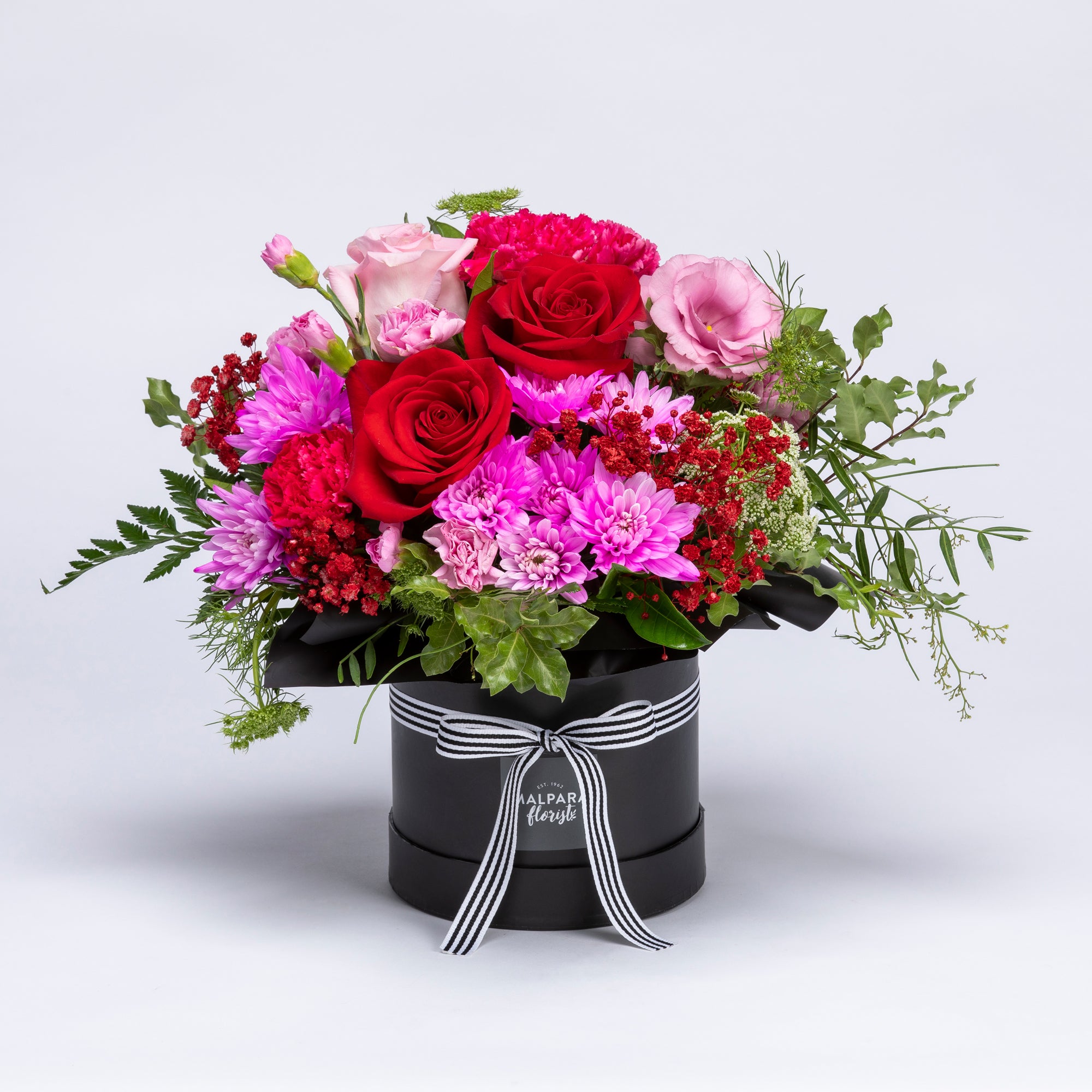 This adorable hat box arrangement features various pink and red blooms in a posy style.