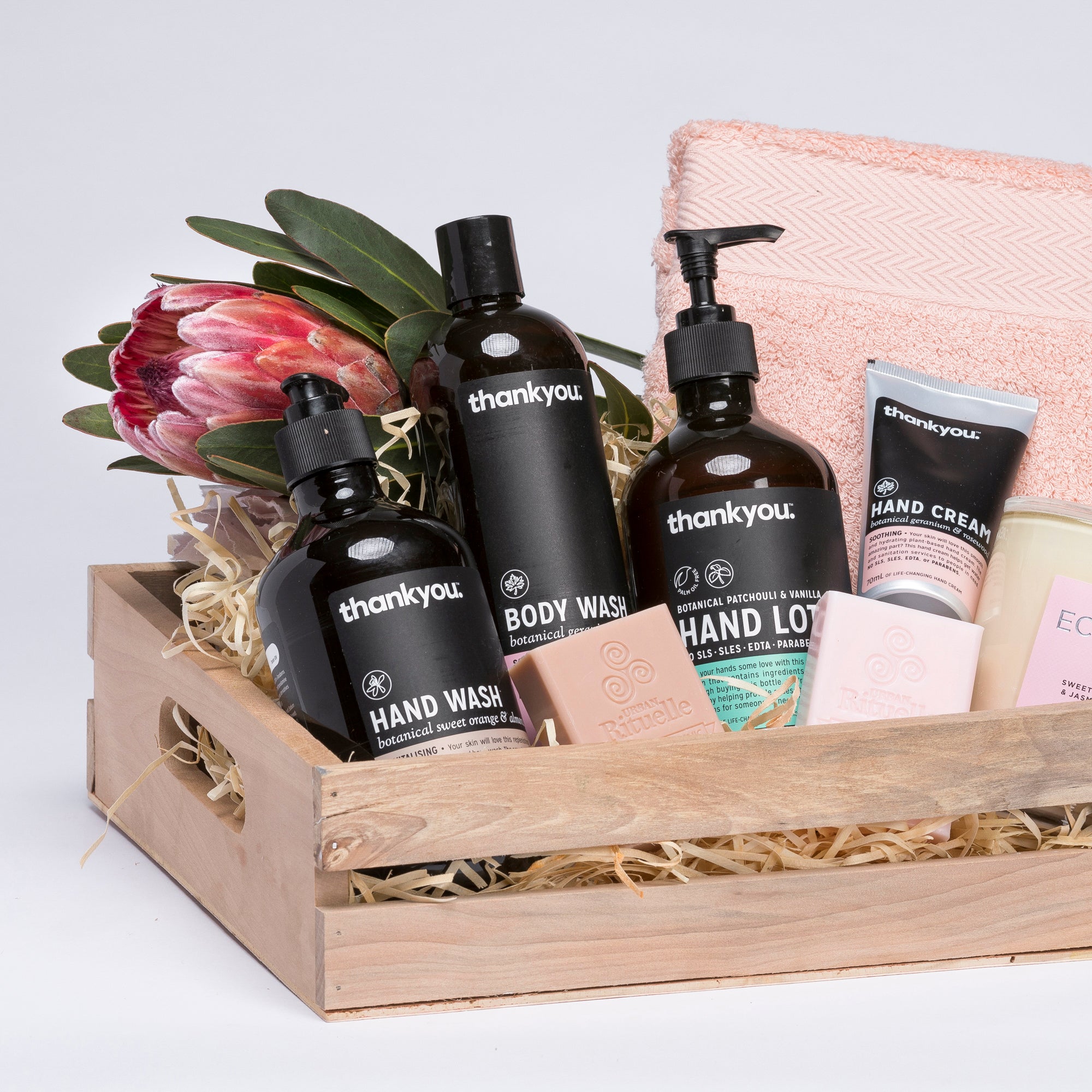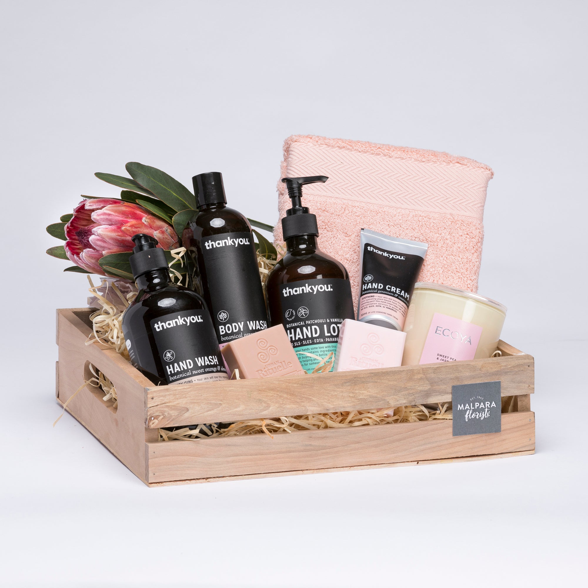 A practical hamper in a rustic wood crate. Includes hand wash, body wash, lotion, hand cream, soaps, Ecoya candle, towel and topped with a Protea flower.