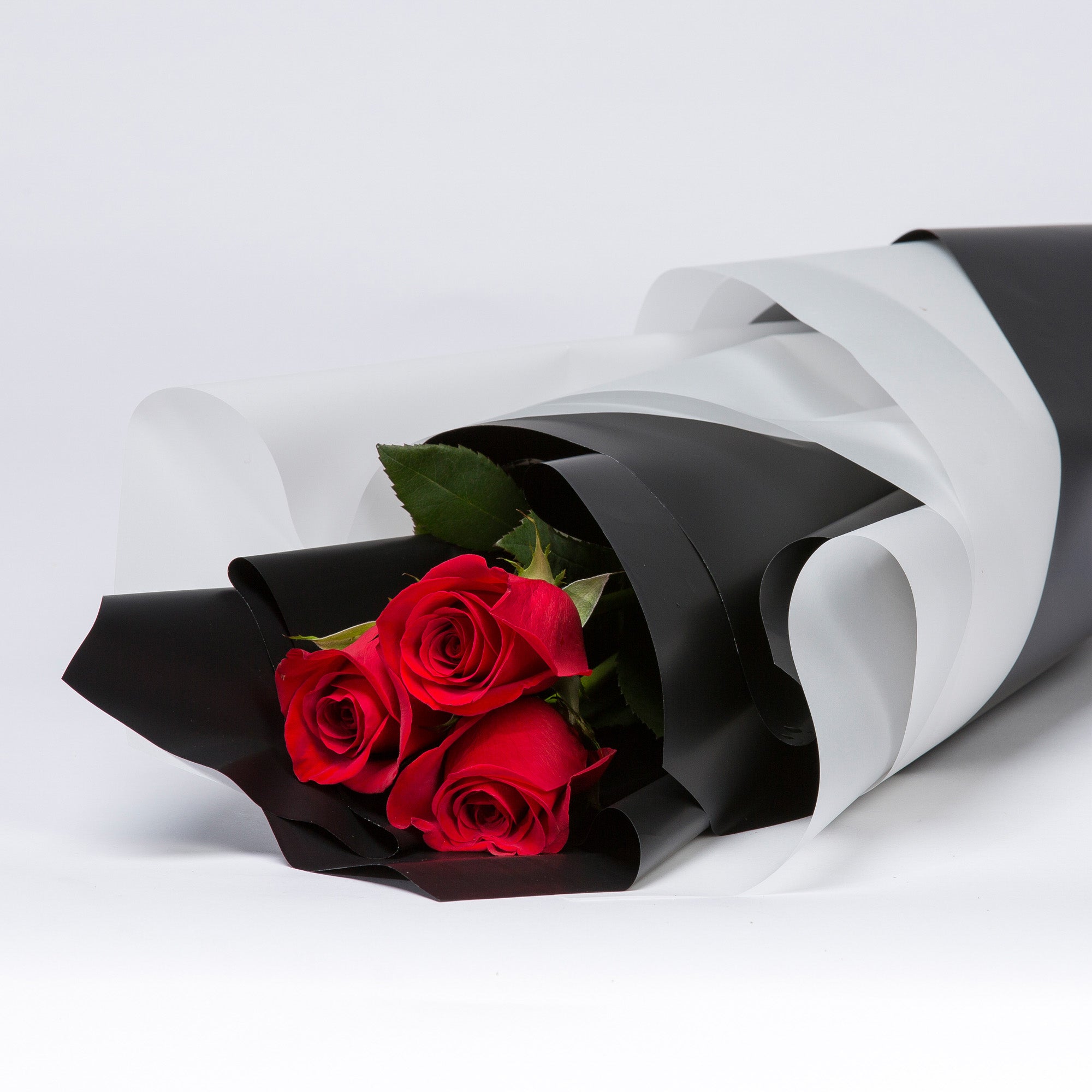 Three exquisite long-stem roses, each reaching approximately 45cm, beautifully presented in elegant wrapping and ribbon to compliment the colour of the roses selected. Perfect for expressing sophistication and romance, this refined arrangement makes an impressive gift for special occasions or a luxurious gesture of appreciation.